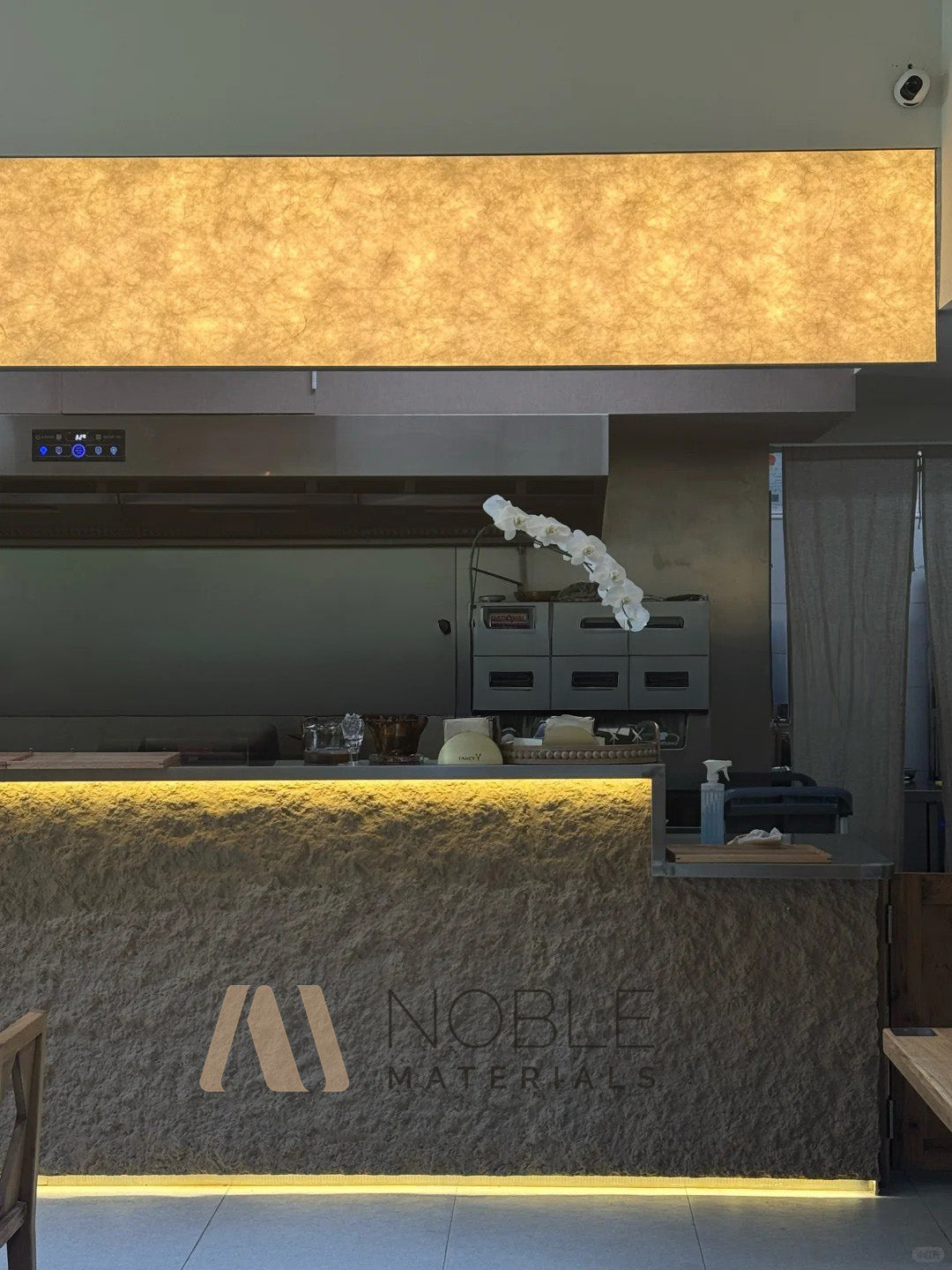 Dun, licht en flexibel steencomposiet paneel met reliëfstructuur.