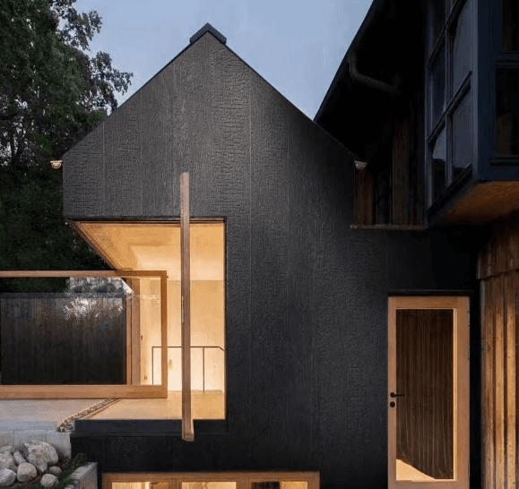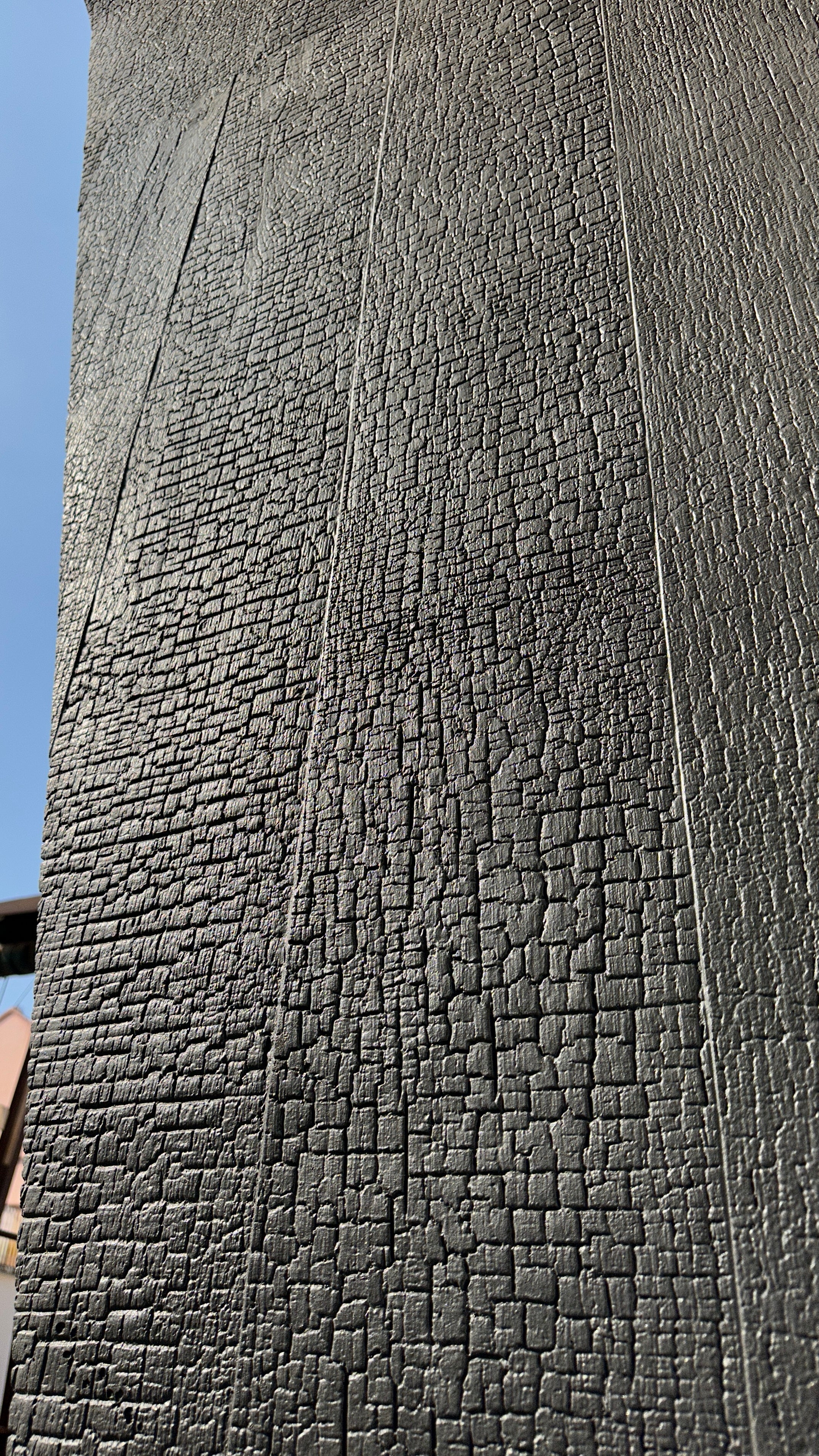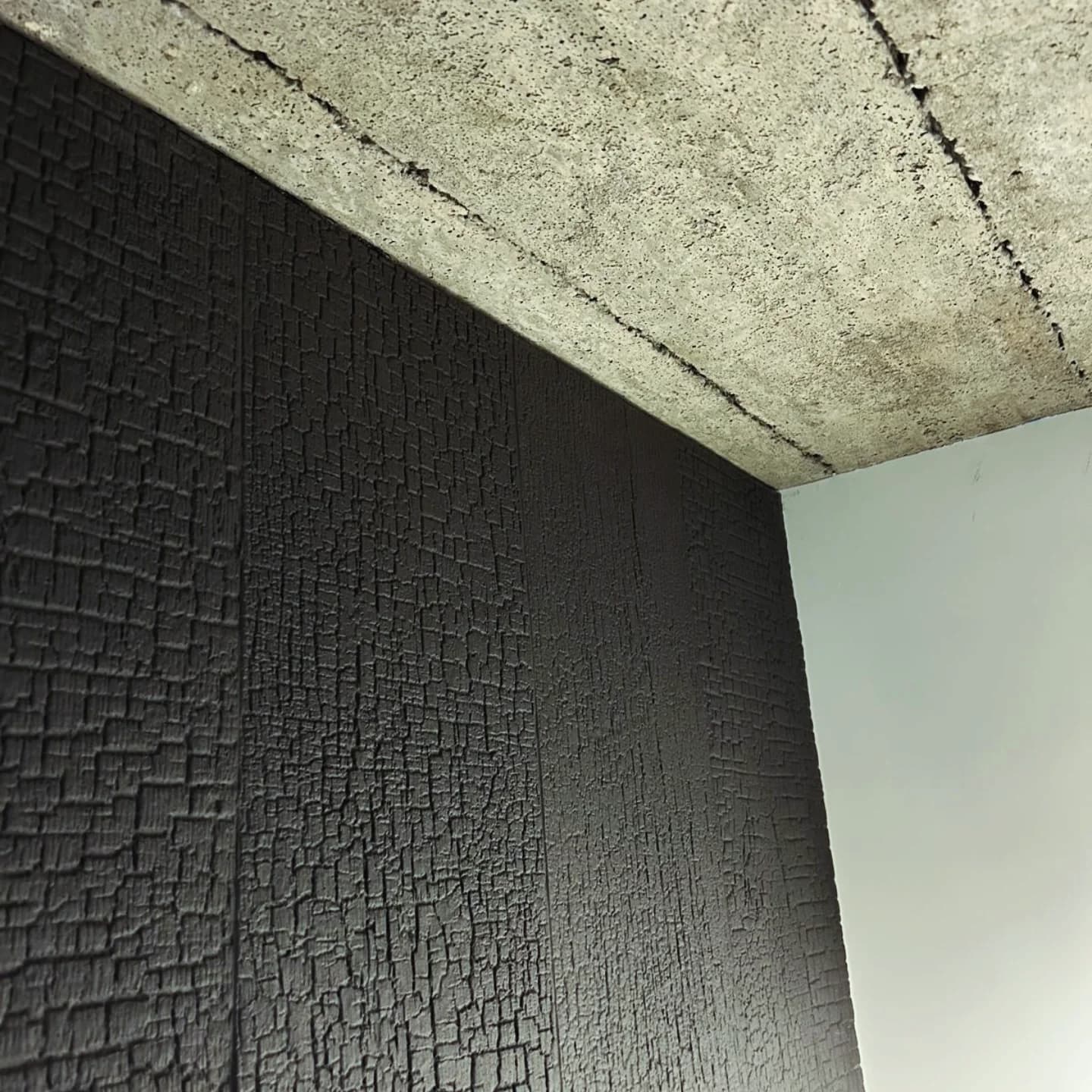 Dun, licht en flexibel steencomposiet paneel met gebrand hout look.